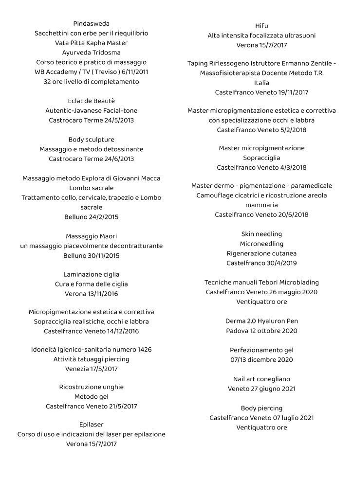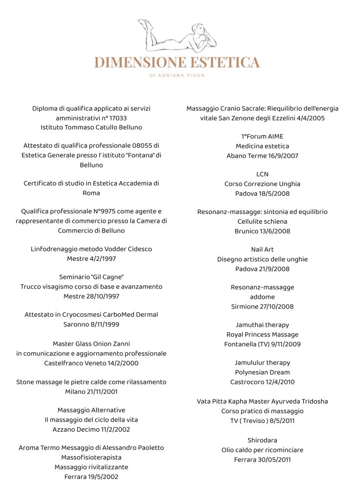 Dimensione Estetica è il luogo perfetto per mettersi in contatto con il proprio benessere attraverso trattamenti antichi, che arrivano da terre esotiche e che il personale estremamente qualificato di Dimensione Estetica a Ponte Nelle Alpi, in provincia di Belluno, propone alla propria clientela sotto forma di massaggi eccezionali e specifici. Scoprili tutti continuando a visitare il sito, e richiedi un appuntamento con Dimensione Estetica per regalarti un attimo di totale benessere.